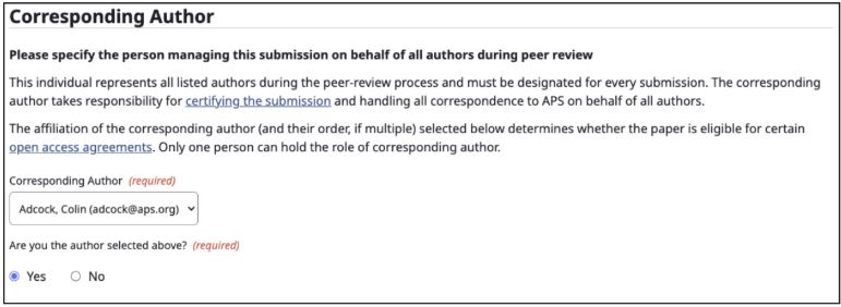 Identita korespondenčního autora musí být následně potvrzena. Tento autor odpovídá za správu manuskriptu v recenzním řízení a je rozpoznán jako způsobilý pro bezplatné OA publikování pod smlouvou s APS.